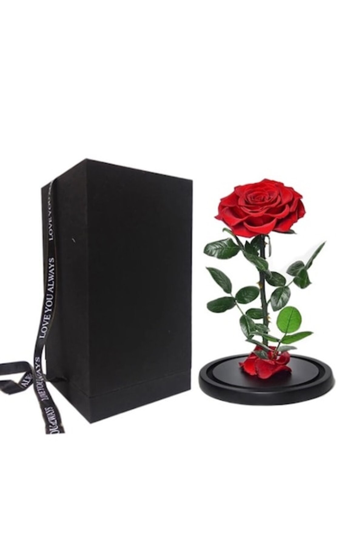 Un aranjament elegant format dintr-un trandafir criogenat roșu, așezat pe o bază de lemn, înconjurat de mușchi proaspăt verde închis, acoperit cu o cupolă de sticlă transparentă, accesorizat cu panglică de satin și dantelă. Acest trandafir într-o cupolă de sticlă este un cadou potrivit pentru orice ocazie, rezistând până la 25 de ani dacă este păstrat în condiții adecvate (temperaturi de până la 22 de grade, ferit de umiditate și lumina soarelui).