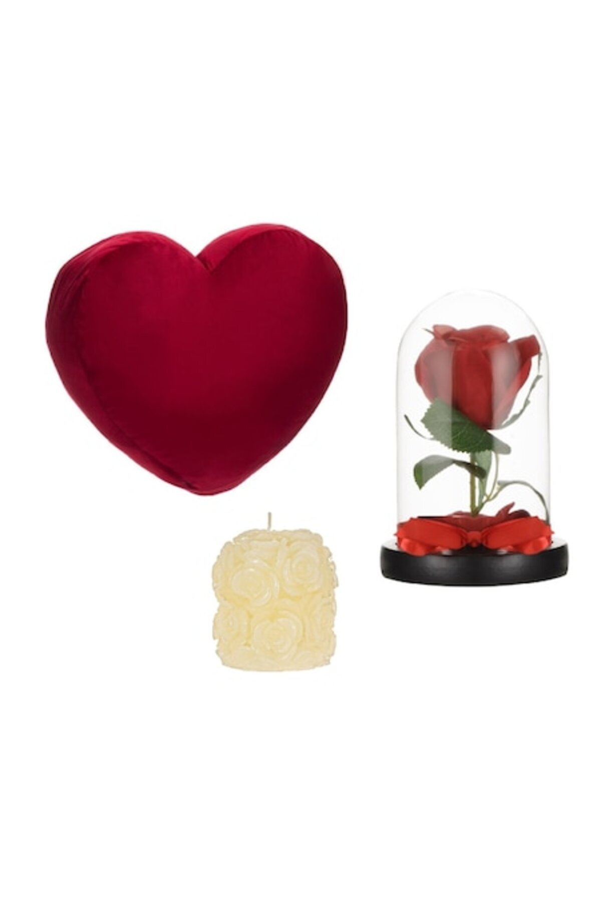 Cadou de Ziua Îndrăgostiților, Trandafir decorativ în cupolă, Lumânare parfumată și Pernă în formă de inimă - Roșu