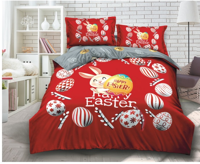 Lenjerie de pat,4 Piese bumbac finet, Tematica de Paste Happy Easter 200 x 230 cm -Concept E Efrall - Rosu