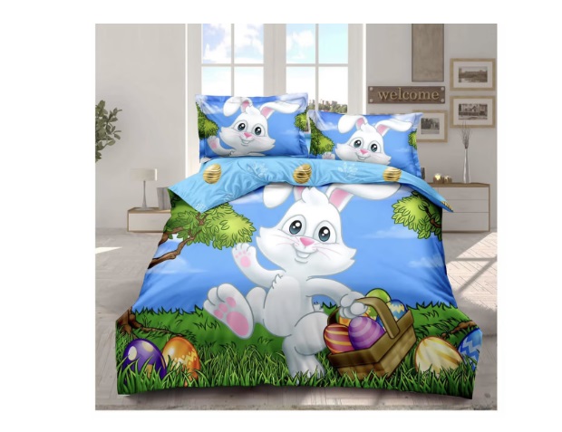 Pregătește-ți locuința pentru sărbători cu această lenjerie de pat premium, decorată cu o tematică adorabilă de Paște. Designul vesel, ce înfățișează un iepuraș simpatic cu un coșuleț de ouă, va aduce imediat o pată de culoare și o atmosferă plină de căldură în dormitorul tău. Este alegerea perfectă pentru a completa decorul festiv și pentru a oferi camerei o notă de prospețime și veselie.