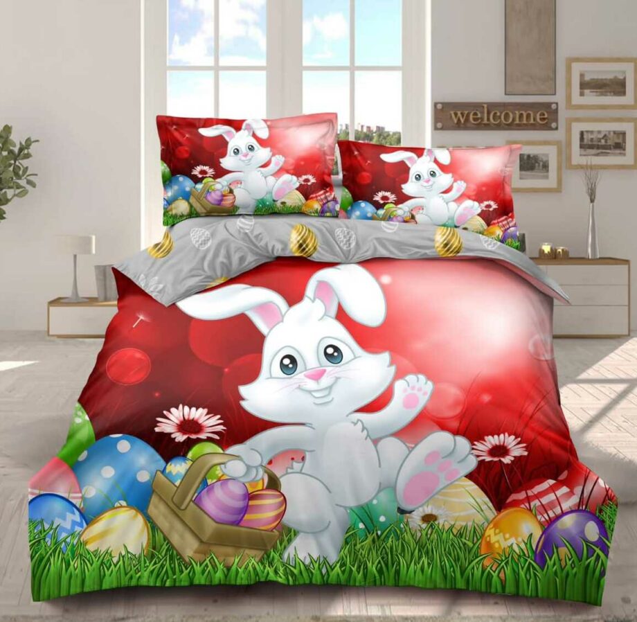 Adu spiritul sărbătorilor în casa ta cu această lenjerie de pat tematică, ideală pentru a crea o atmosferă caldă și primitoare. Modelul vibrant în nuanțe de roșu, decorat cu iepurași drăgălași și coșulețe cu ouă, va deveni imediat punctul central al dormitorului tău. Este alegerea perfectă pentru a aduce un plus de personalitate și bucurie în perioada sărbătorilor pascale, oferind în același timp un aspect elegant și rafinat încăperii.
