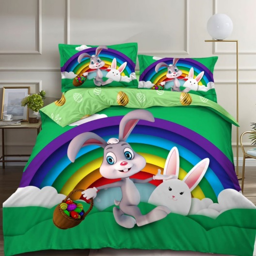 Transformă atmosfera dormitorului tău într-un spațiu plin de veselie și confort cu această lenjerie de pat cu tematică de Paște. Designul vibrant pe un fundal verde proaspăt, decorat cu iepurași adorabili, aduce spiritul primăverii direct în casa ta. Fabricată din bumbac finet de înaltă calitate, această lenjerie nu este doar o piesă decorativă, ci și o promisiune pentru un somn odihnitor și relaxant.