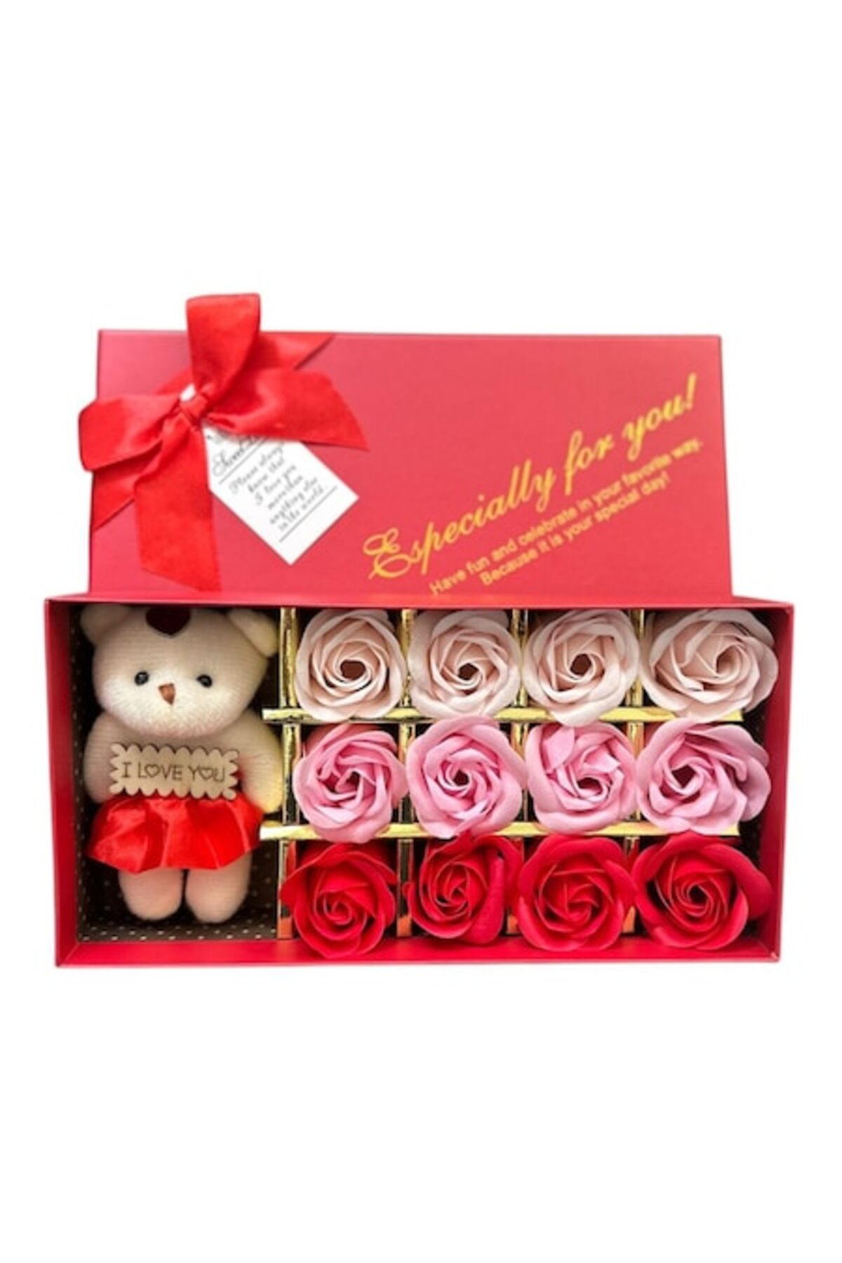 Set cadou cu trandafiri de săpun cu ursuleț de pluș, cutie roșie elegantă, multicolor - Rosu
