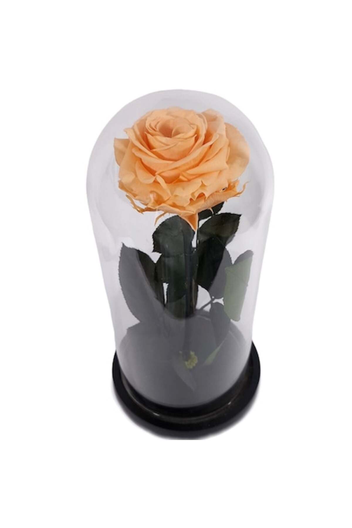 Trandafirul piersică conservat premium (∅8cm) într-o cupolă de sticlă (∅12, H25cm) pe o bază din lemn negru.; Acest trandafir conservat este o operă de artă vie, păstrată într-un moment etern de frumusețe.; Acest trandafir unic, atent selectat și supus unei transformări delicate, își păstrează aspectul proaspăt și încântător ani de zile, fără a avea nevoie de apă sau lumină specială.; Este simbolul perfect al perfecțiunii eterne, un dar al iubirii care nu se ofilește niciodată și o mărturie a frumuseții care transcende timpul.; Trandafirul conservat nu este doar o floare, ci o experiență vizuală și emoțională, o poveste de dragoste păstrată pentru a încânta sufletul în fiecare zi.; Plasat sub o elegantă cupolă de sticlă, acest trandafir reprezintă o expresie rafinată a eleganței și luxului, fiind cadoul ideal pentru orice ocazie specială.; Nu necesită îngrijire sau tratament special.; Nu îl expuneți la lumina directă a soarelui și nu îl udați.