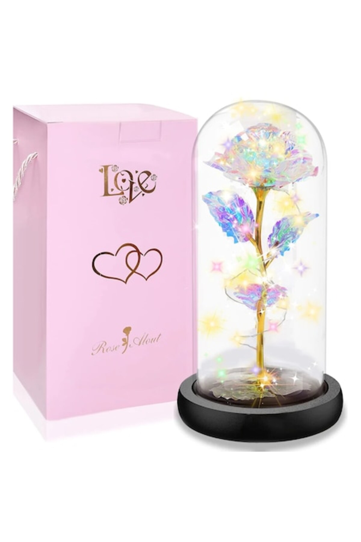 Trandafir criogenat, cupolă de sticlă, lumini LED, cutie elegantă, lucrat manual, 22 x 11 cm - Multicolor