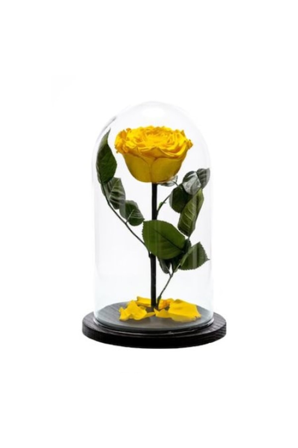 Trandafir criogenat galben de la marca ROSE AMOR, cei mai durabili trandafiri din România.; Aveți ocazia să oferiți ceva cu adevărat excepțional unei persoane dragi: un trandafir special de 6,5cm sub o superbă cupolă de sticlă de 25cm.; Întregul ansamblu este conceput pentru a încânta ochii și sufletul unei persoane sensibile care apreciază fiecare moment de frumusețe pe care ni-l oferă natura.; Trandafirii nemuritori, deși nu vor rezista pentru totdeauna, își pot păstra aceeași frumusețe mulți ani (până la 25 de ani) și ne pot însenina zilele dacă îi ținem aproape.; Alegeți din oferta noastră de trandafiri criogenați în culoarea preferată și vă vom livra acest cadou minunat la ușa în cel mai scurt timp.