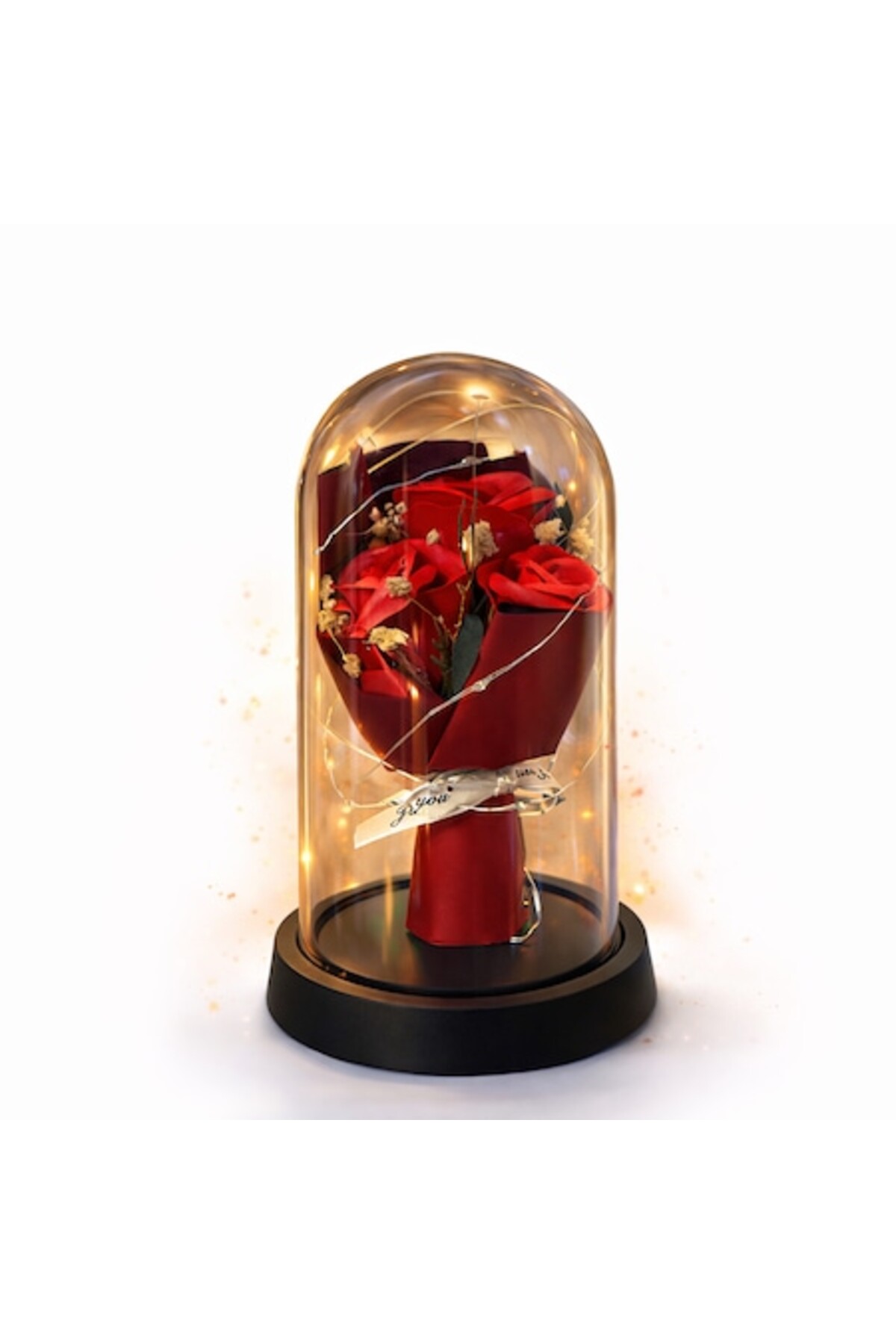 Adăugați o notă de rafinament și emoție fiecărei ocazii cu acest trandafir decorativ de săpun, un cadou elegant și simbolic, menit să impresioneze.; Realizat cu atenție la detalii, trandafirul are un aspect realist, plasat într-o cupolă transparentă din plastic care îl protejează și îi evidențiază frumusețea.; Iluminarea ambientală LED oferă un efect vizual spectaculos, transformând produsul într-un element decorativ premium pentru orice cameră.; Cu o înălțime de 20 cm, acest trandafir de săpun în cupolă este ideal atât ca obiect decorativ, cât și ca idee de cadou pentru ocazii speciale.; Spre deosebire de flori, trandafirul de săpun nu se ofilește, menținându-și eleganța și parfumul subtil în timp.; Este alegerea perfectă pentru cei care caută un cadou semnificativ, cu impact și durabil.