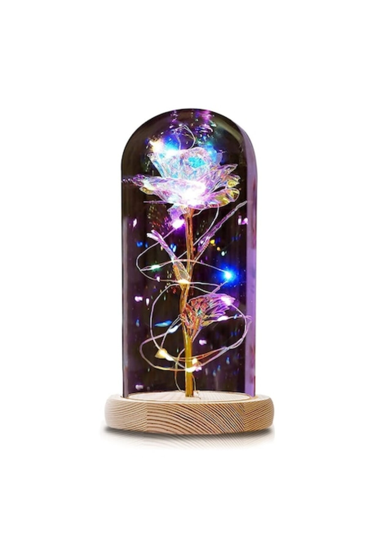 Acest produs are o construcție din metal placat cu aur de 24k, lemn și sticlă, cu o culoare violetă. Include o lumină LED, o cupolă de sticlă, o bază din lemn și o cutie cadou. Dimensiunile sunt de 24 x 11,5 cm. Baterii necesare: 3 x AAA (nu sunt incluse).