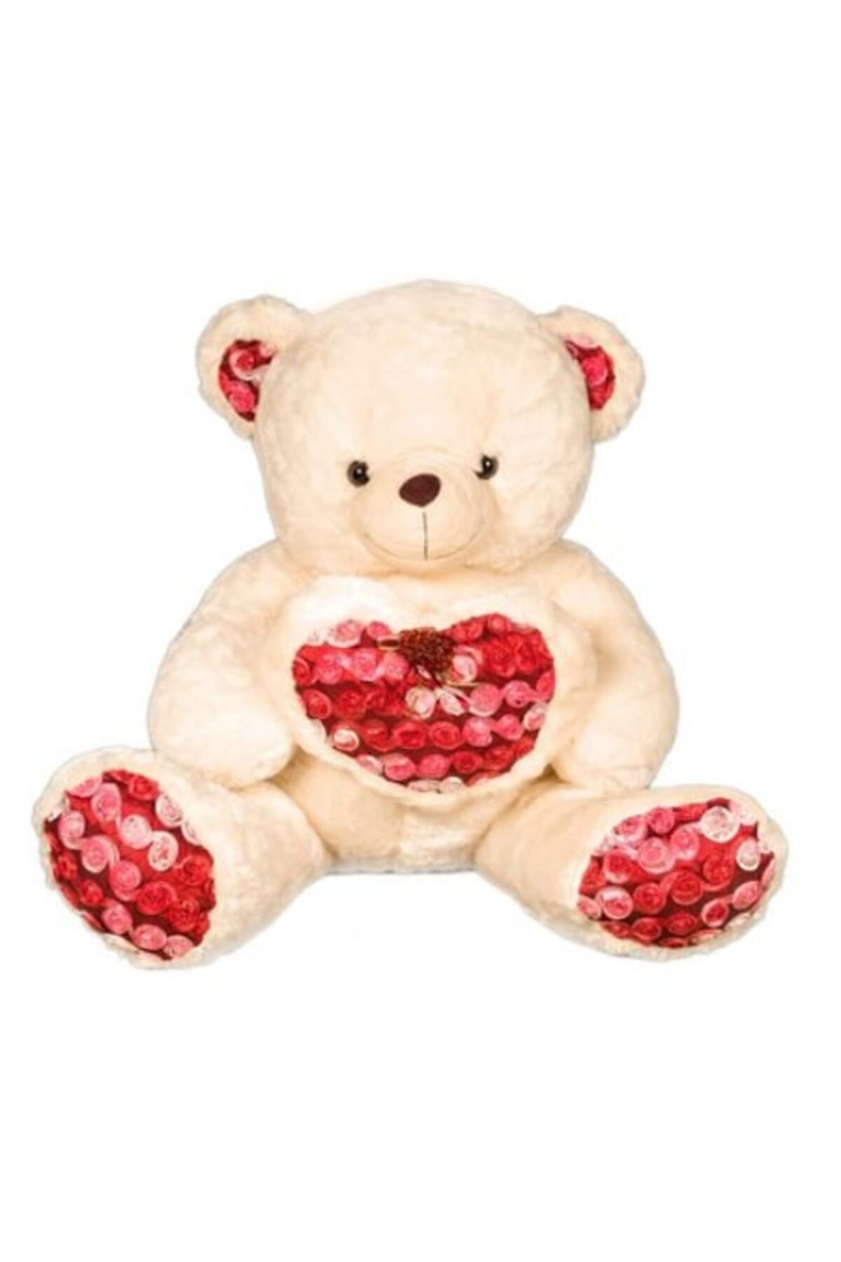 Ursuleț pufos 50 cm cu inimă 90 cm și trandafiri aplicați, - Roșu